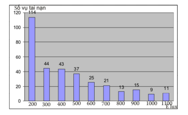 Các nhà khoa học Đức cũng nghiên cứu tương quan giữa độ rọi chiếu sáng và tai nạn lao động thông qua phân tích 347 trường hợp tai nạn lao động có liên quan đến chiếu sáng, thể hiện trong biểu đồ dưới đây.